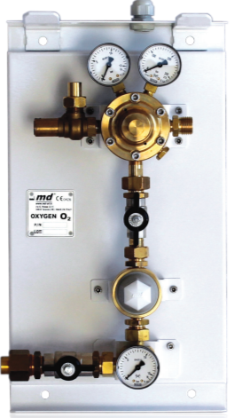 - Двухступенчатый аварийный центральный блок для распределения медицинских газов, максимальный расход 40 Нм3/ч